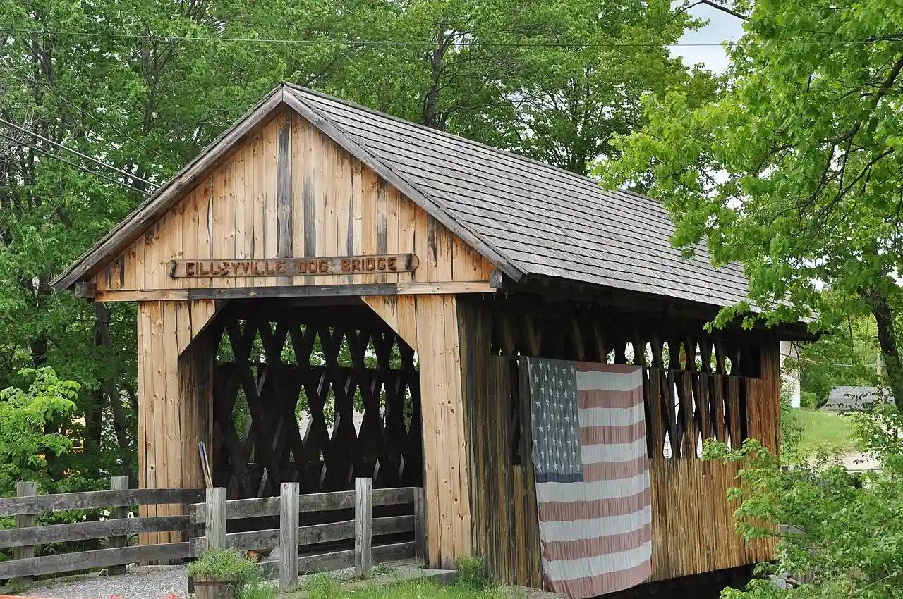 The Bog Bridge, also known as the Cilleyville Bridge, is a historic covered bridge in Andover, New Hampshire. Built in 1887 and located off New Hampshire Route 11 west of Andover center, the Town lattice truss bridge is one of New Hampshire's few surviving 19th-century covered bridges, and is relatively little altered since its construction, having had its roof replaced and an abutment reconstructed. The bridge was listed on the National Register of Historic Places in 1989. Read more on Wikipedia