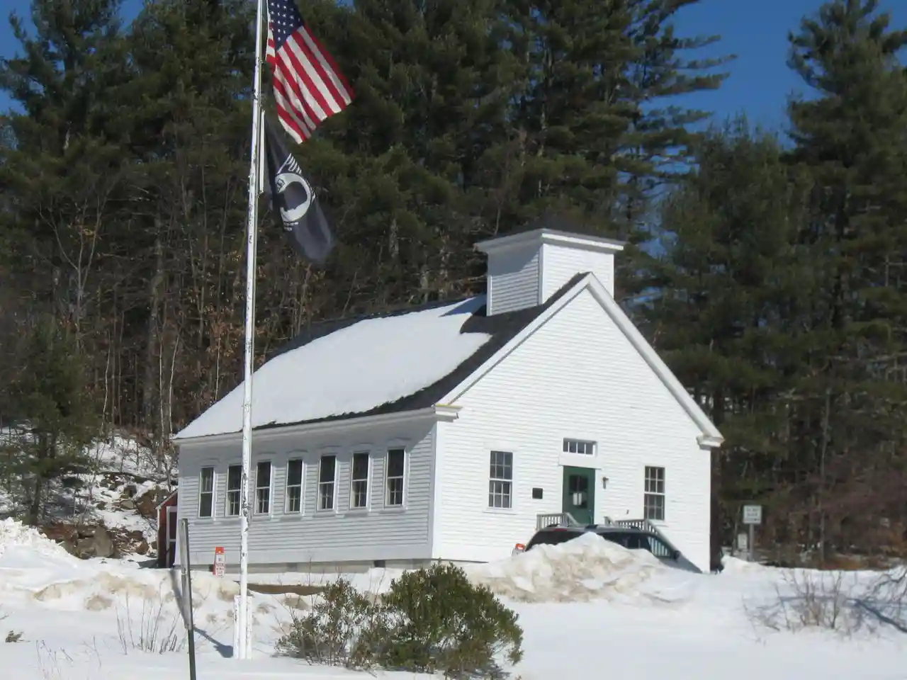 The Dame School is a historic meeting house, school, and now local historical museum, on New Hampshire Route 152 in Nottingham, New Hampshire. The single story wood-frame Greek Revival structure was built in 1840 as a church; according to local legend, timbers from a 1740 church were used in its construction. Its main facade has a simple entrance topped by a transom window, and flanked by a pair of windows. The building is topped by a three-stage tower, whose second stage houses a belfry, and whose spire is topped by a weathervane in the shape of a quill pen. It was used as a meeting house until about 1878, with its dual use as a school beginning c. 1870. It was dedicated for academic use in 1878, after the local Universalist congregation which had been using for services, built its own dedicated building. This building is said to have acquired its distinctive weathervane as a gift in 1870 from schoolmaster Bartholomew Van Dame. Read more on Wikipedia