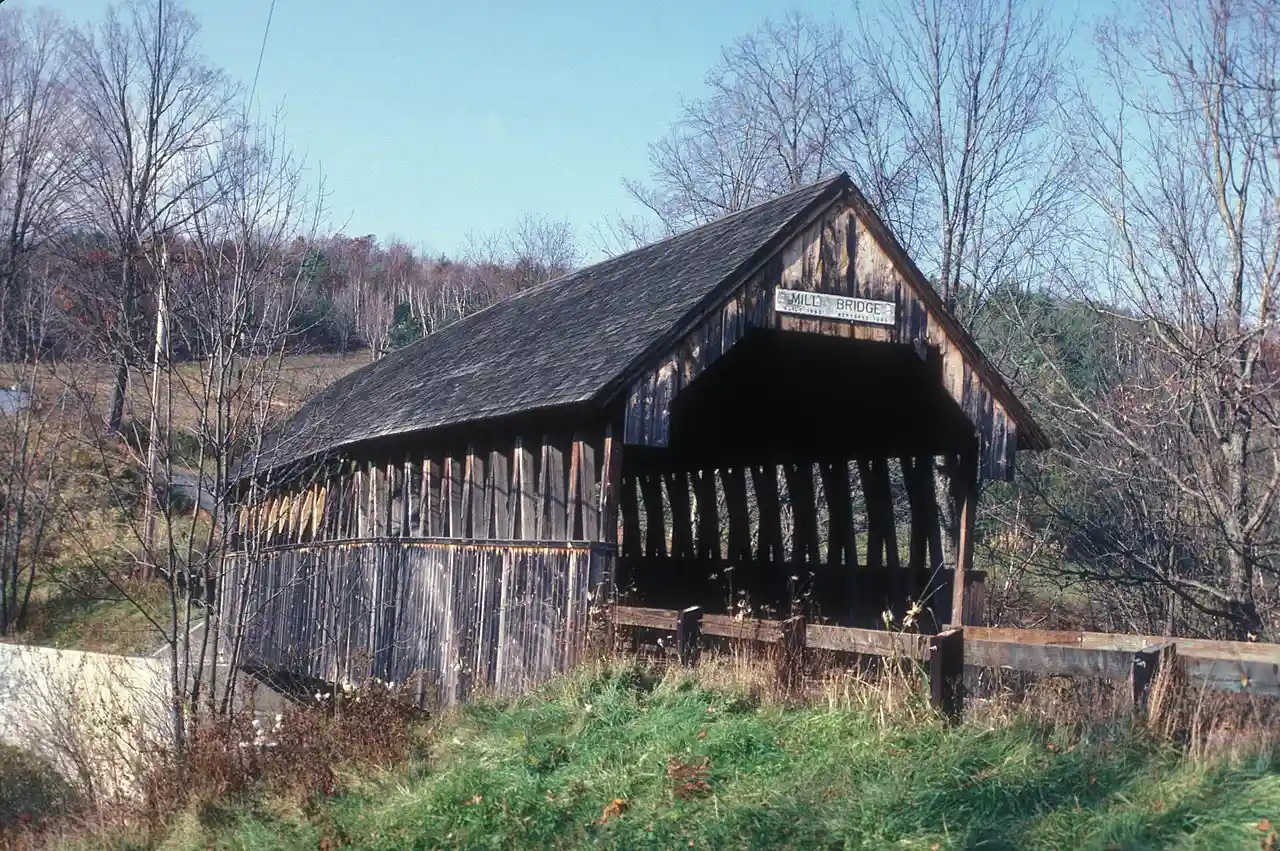 The Meriden Bridge is a historic covered bridge in the Meriden area of Plainfield, New Hampshire. The bridge is a single span which carries Colby Hill Road over Bloods Brook, just west of a junction with Main Street and Willow Brook Road. Built about 1880, it is one of New Hampshire's few surviving 19th-century covered bridges. It was listed on the National Register of Historic Places in 1980. Read more on Wikipedia