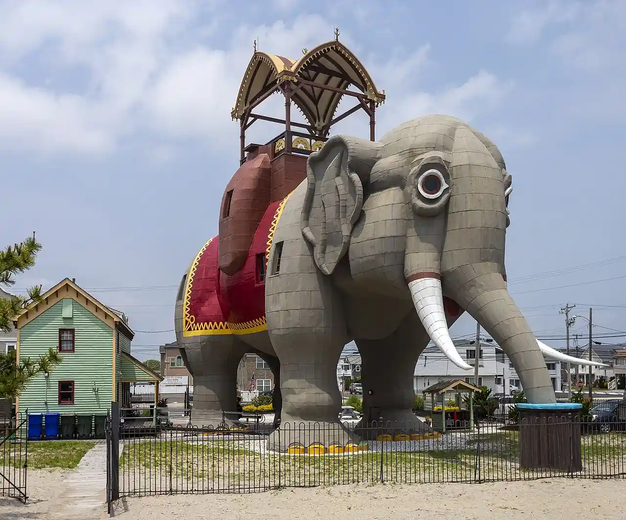 Lucy the Elephant is a six-story elephant-shaped example of novelty architecture, constructed of wood and clad in tin in 1882 by James V. Lafferty in Margate City, New Jersey, approximately five miles (8 km) south of Atlantic City. Originally named Elephant Bazaar, Lucy was built to promote real estate sales and attract tourists. Today, Lucy is the oldest surviving roadside tourist attraction in America. Read more on Wikipedia
