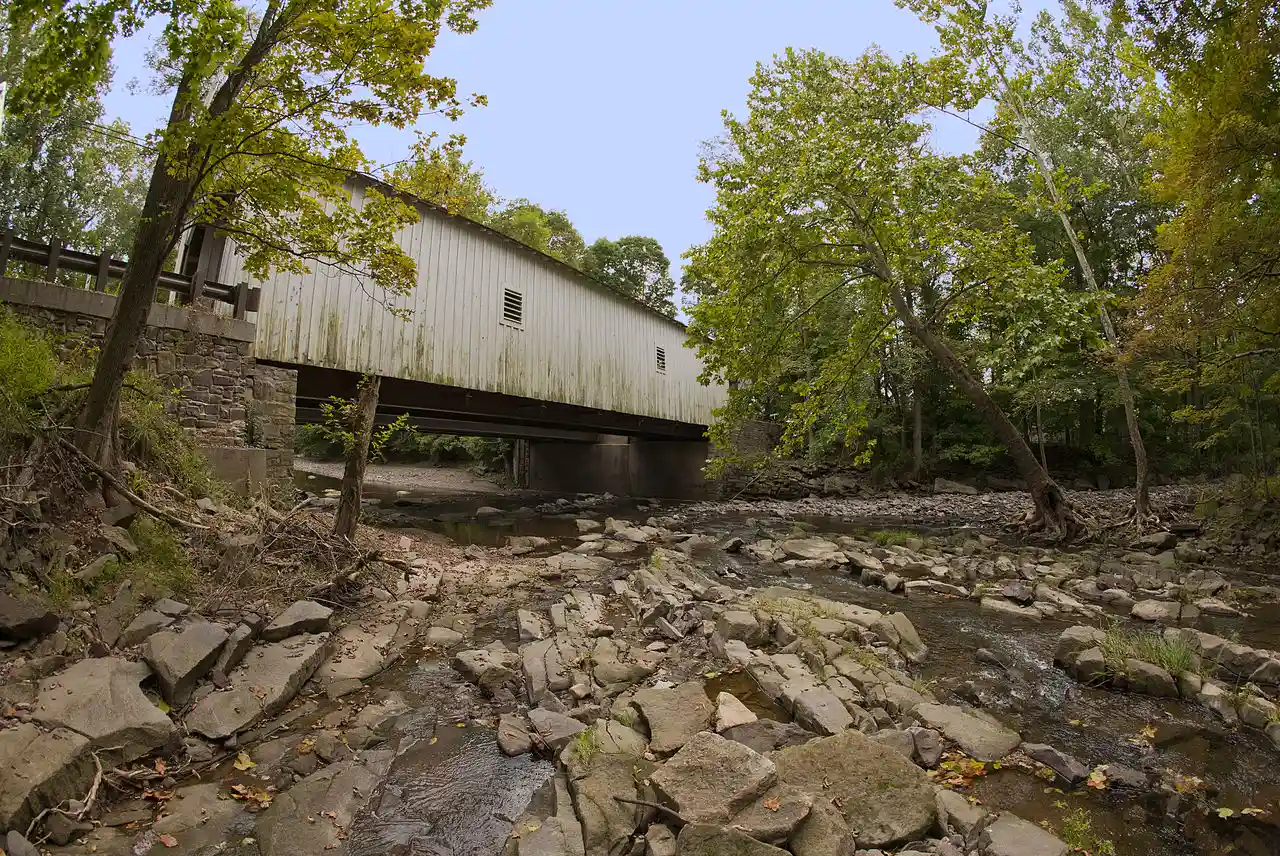 Green Sergeant's Covered Bridge is a wooden covered bridge over the Wickecheoke Creek near the border between the Hunterdon Plateau and Amwell Valley located in Delaware Township, Hunterdon County, New Jersey. As the last historic covered bridge in the state of New Jersey, it was listed on the National Register of Historic Places on November 19, 1974 for its significance in engineering and transportation (the Scarborough Bridge in Cherry Hill is the only other covered bridge in New Jersey). With It was added as a contributing property to the Covered Bridge Historic District in 1999. Read more on Wikipedia