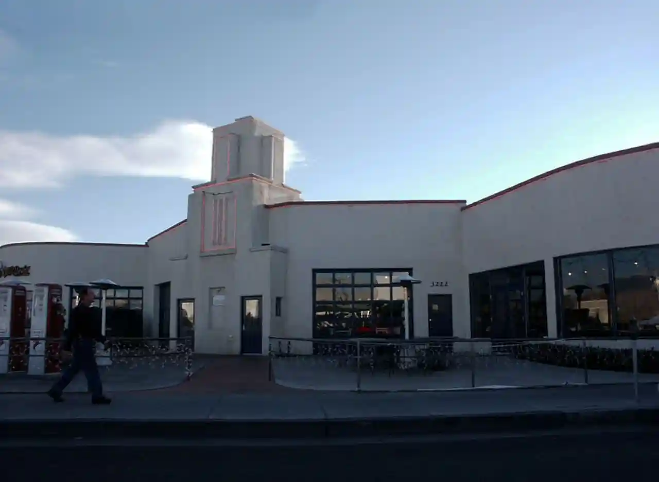 Jones Motor Company is a historic U.S. Route 66-era building in Albuquerque, New Mexico. Built in 1939, on Central Avenue in the Nob Hill neighborhood of Albuquerque, the building originally housed Ralph Jones' service station and Ford Motor Company car dealership. It was designed by Tom Danahy in the Streamline Moderne style, with curved garage bays surmounted by a central stepped tower. Read more on Wikipedia