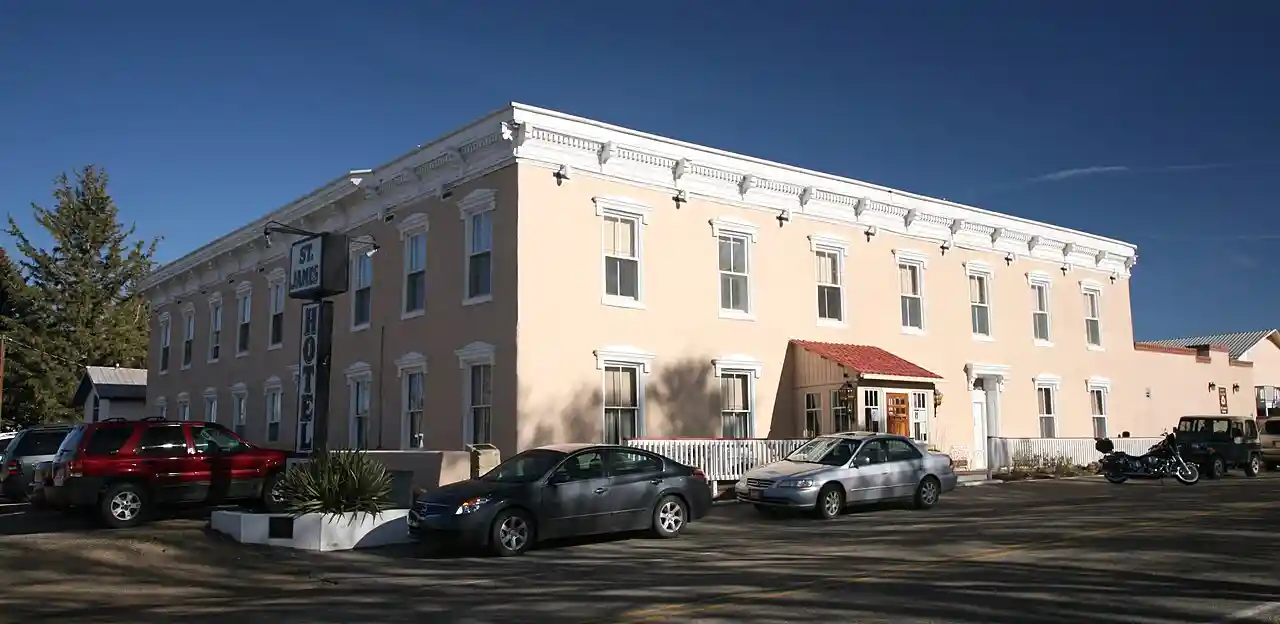The St. James Hotel, located in historic downtown Cimarron, New Mexico, is a historic hotel, restaurant and bar. Today, guests can stay at the historic hotel, in either the historic section (main building with bar and restaurant) or in a modern addition (new building). The hotel is in the National Register of Historic Places and is part of the Cimarron Historic District. Read more on Wikipedia