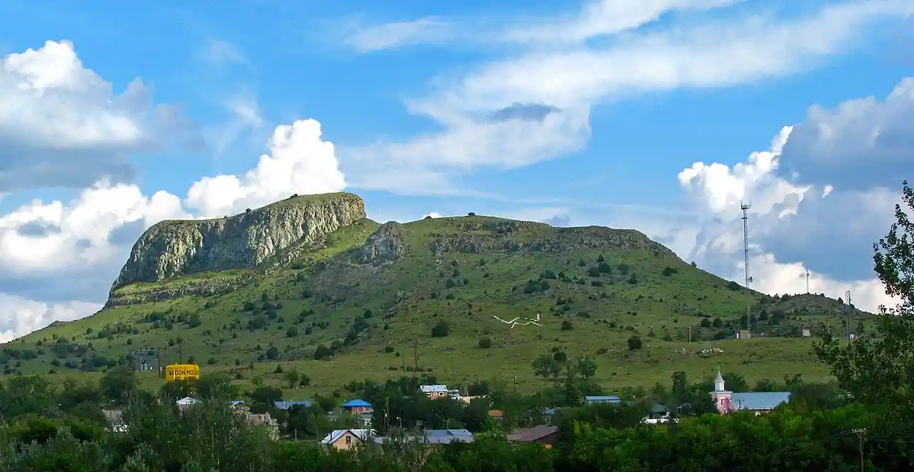 The Wagon Mound is a butte that was a major landmark for pioneers along the Cimarron Cutoff of the Old Santa Fe Trail, a well-known settlement route connecting St. Louis, Missouri and Santa Fe, New Mexico. It is located just east of Wagon Mound, New Mexico, a village named after the butte. The butte is a designated National Historic Landmark, along with Santa Clara Canyon, a site just northwest of the village where travelers on the trail frequently camped and took on water. Read more on Wikipedia