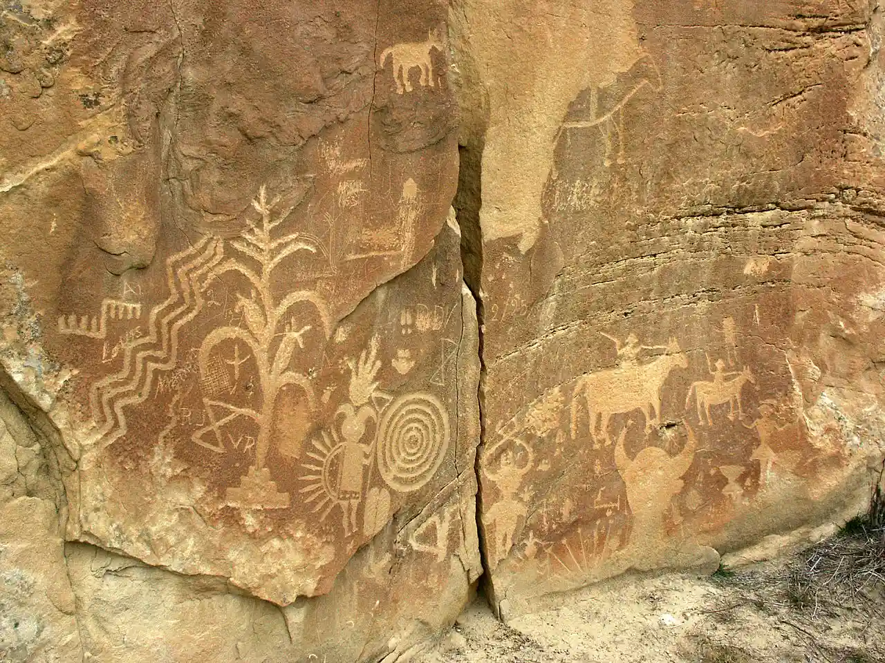 The Crow Canyon Archaeological District is located in the heart of the Dinétah region of the American Southwest in Rio Arriba and San Juan counties in New Mexico approximately 30 miles southeast of the city of Farmington. This region, known to be the ancestral homeland of the Navajo people, contains the most extensive collection of Navajo and Ancient Pueblo petroglyphs or rock art in the United States. Etched into rock panels on the lower southwest walls of the canyon are petroglyphs or rock art depicting what is believed to be ceremonial scenes and symbolic images that represent the stories, traditions and beliefs of the Navajo people. Dating back to the 16th, 17th, and 18th centuries, the petroglyphs have maintained their integrity despite the environmental conditions of the canyon and the effects of tourism. Among the ruins in the Crow Canyon Archaeological District there is also a cluster of Navajo defensive structures or pueblitos, which were built in the 18th century during periods of conflict with the Utes and the beginnings of Spanish Colonialism. Read more on Wikipedia