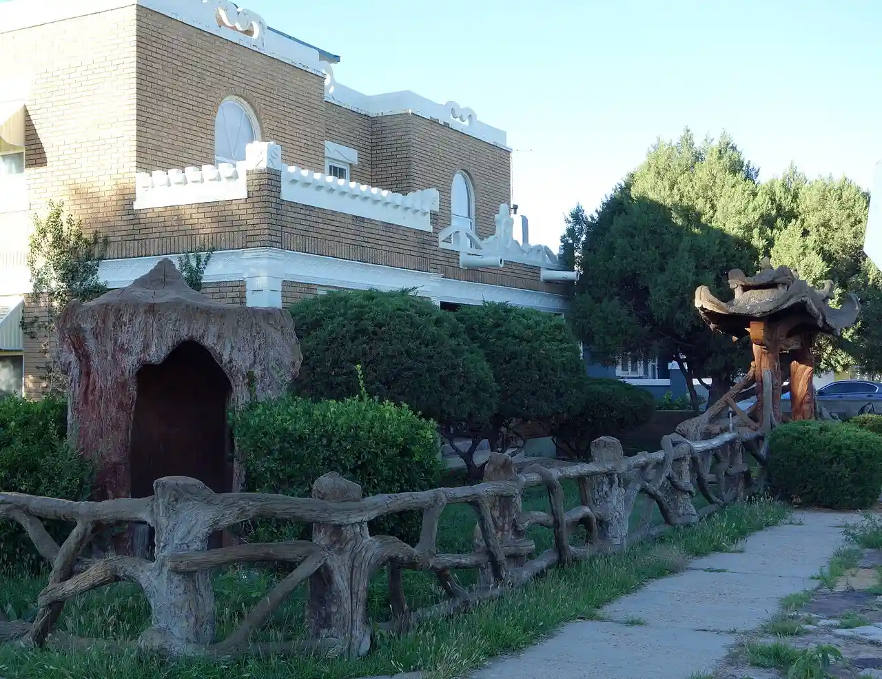 The Gate, Fence and Hollow Tree Shelter Designed by Dionicio Rodriguez is a work by noted artist Dionicio Rodriguez that is located at 320 Oak St. in Clayton, New Mexico. It consists of three faux bois sculptures created in 1943. Speculator Bayliss C. Froman commissioned the sculptures on his property after seeing Rodriguez's work on a visit to San Antonio. The sculptures include a gate resembling the entrance to the San Antonio Japanese Tea Garden, an intertwining log fence, and a hollow tree with textured bark. Read more on Wikipedia