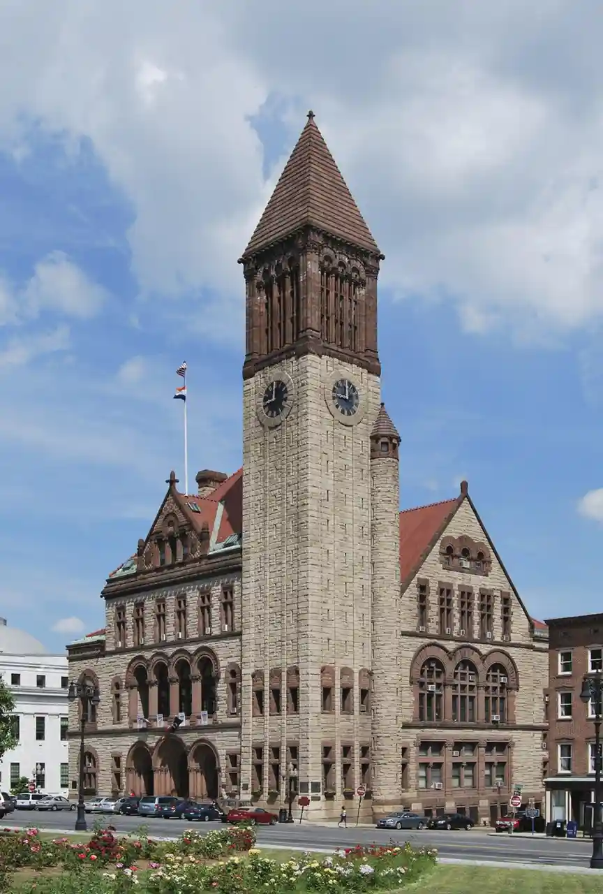 Albany City Hall is the seat of government of the city of Albany, New York, United States. It houses the office of the mayor, the Common Council chamber, the city and traffic courts, as well as other city services. The present building was designed by Henry Hobson Richardson in the Romanesque style and opened in 1883 at 24 Eagle Street, between Corning Place (then Maiden Lane) and Pine Street. It is a rectangular three-and-a-half-story building with a tower at its southwest corner. The tower contains one of the few municipal carillons in the country, dedicated in 1927, with 49 bells. Read more on Wikipedia
