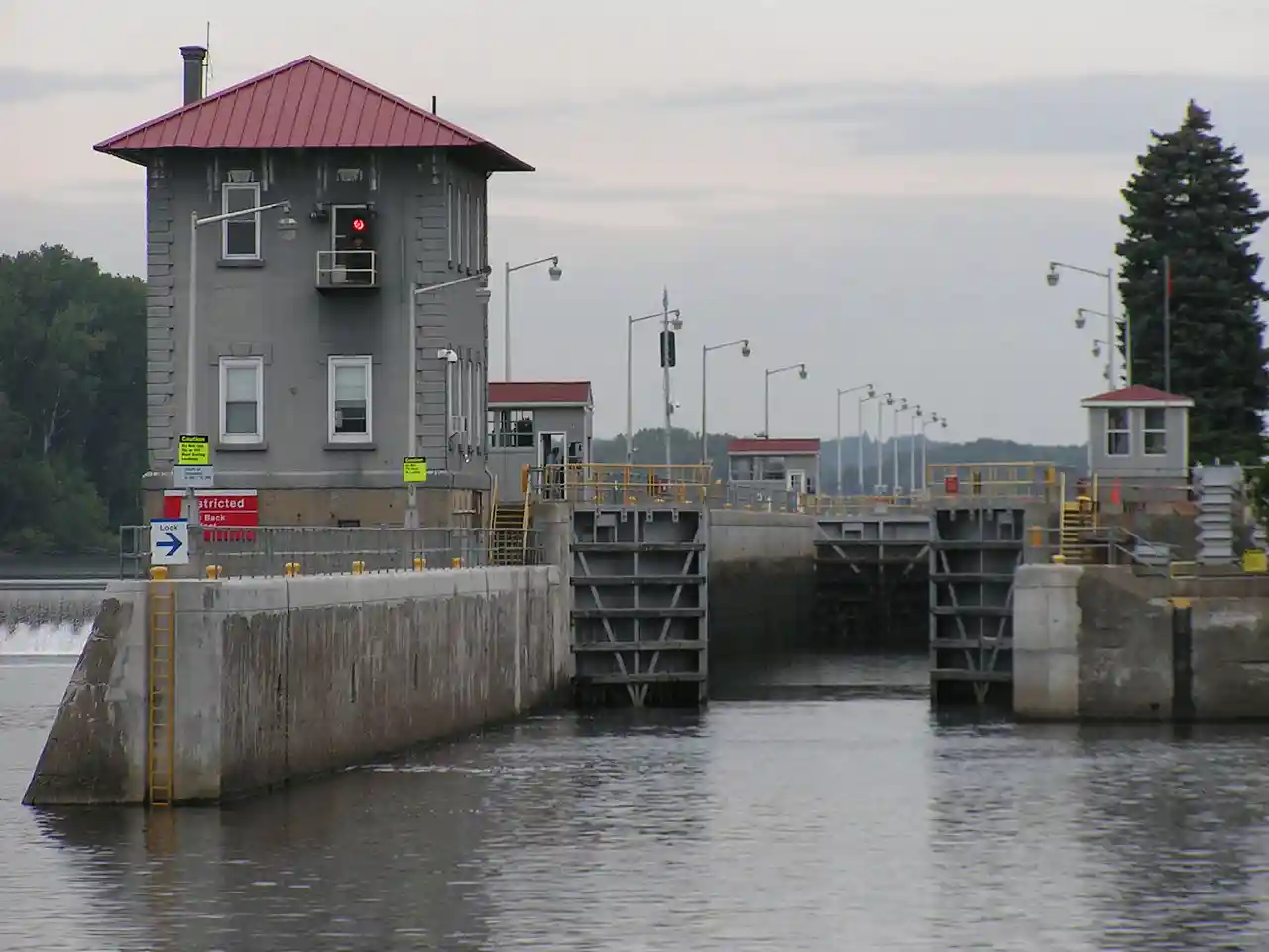 The Federal Dam is a manmade dam built across the Hudson River in the U.S. state of New York from Troy on the east bank to Green Island on the west bank. The major function of the dam is to improve navigability. It is located at mile 153 of the Hudson River, measuring from the beginning of the Hudson as a Federally Navigable Waterway near the Battery in Manhattan. The location of the dam marks the upper end of the Hudson River estuary. Read more on Wikipedia