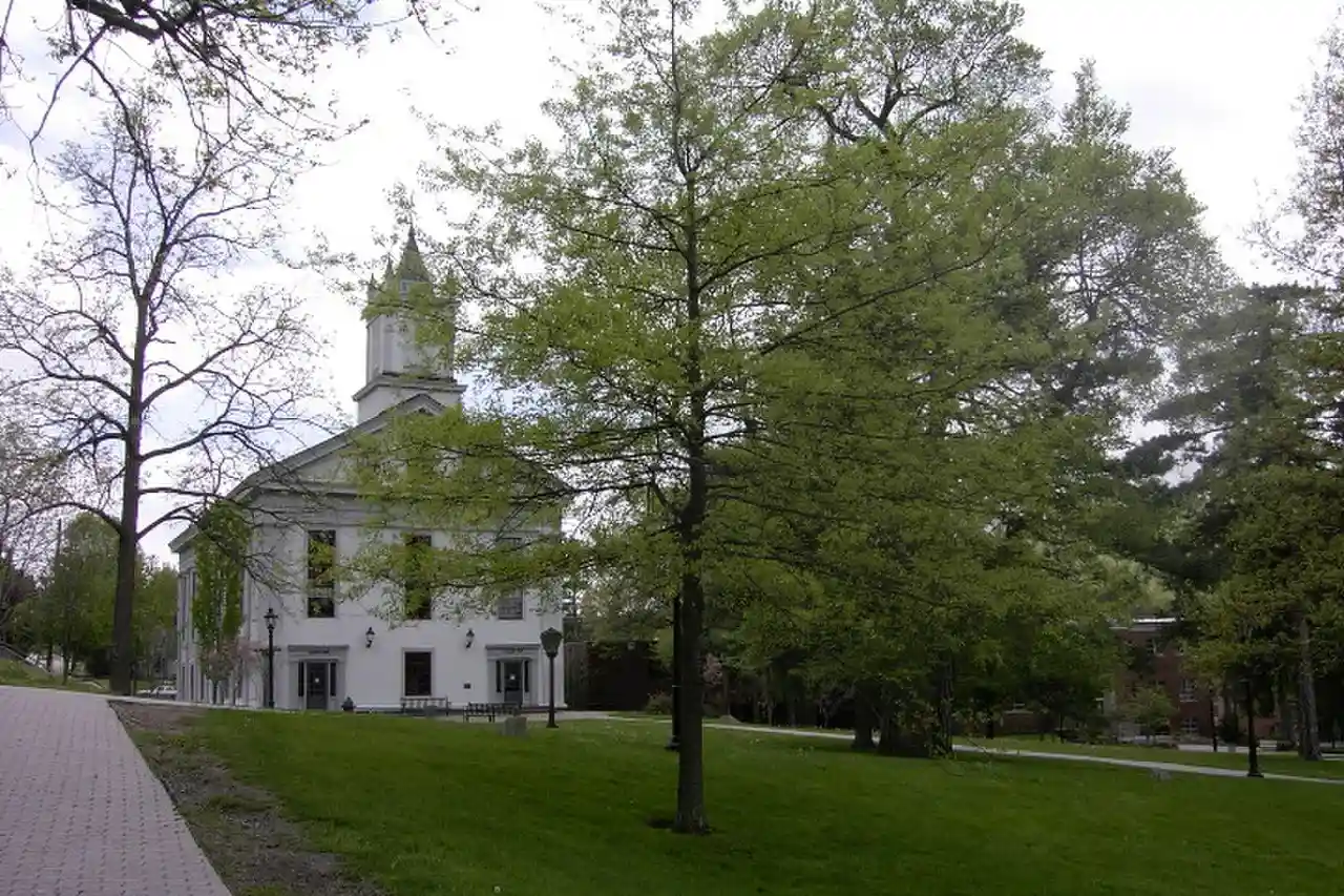 Alumni Hall, also known as Chapel Hall, is a historic multipurpose building located on the campus of Alfred University at Alfred in Allegany County, New York. It is a large frame structure built in 1851–1852 with what has been described as Alfred's most important Greek Revival features. The three-story, by rectangular structure has a red terra cotta roof. Designed and built by Maxson Stillman, it features a one of a kind 12 foot pine weathervane in the shape of a quill pen. It was the fourth structure built for the Alfred Academy and housed a chapel, auditorium and lecture, recitation, library and lyceum rooms for college and community use. See also: It is now used primarily to house the Admissions Department. Read more on Wikipedia
