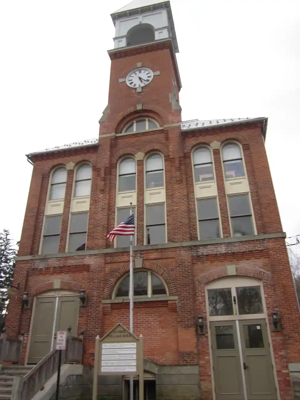 Fireman's Hall is a historic fire hall located at Alfred in Allegany County, New York. It was built in 1890-1891 by volunteer firemen as the first home of the A.E. Crandall Hook & Ladder Co. It is a massive three story brick and sandstone structure that features an imposing bell / clock tower. The clock, designed by Seth Thomas, was donated by the Samuel Stillman family after the Village ran out of funds for the hall. The weather vane atop depicts a firefighter on a ladder. The building has housed village offices since the 1970s, as well as village court, police station and meeting hall today. Note: This includes and Accompanying seven photographs Read more on Wikipedia