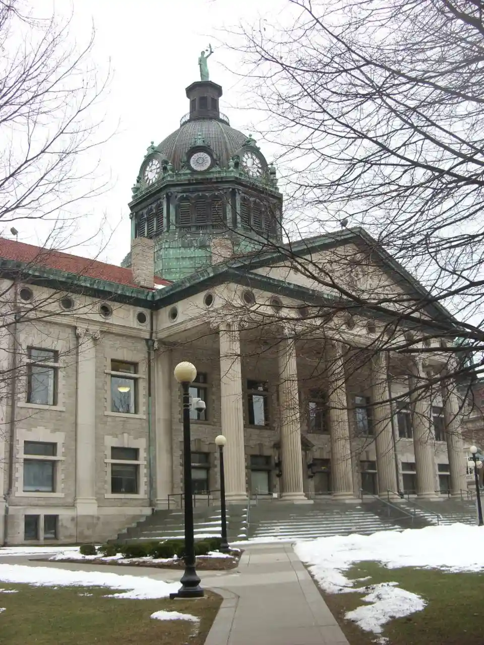 Broome County Courthouse is a historic courthouse located at Binghamton in Broome County, New York. It is a massive -story structure, built on a raised foundation, in the form of a Latin Cross and topped with an elegant copper dome. Originally constructed in 1897–1898 in a "T" shape, the south wing was added in 1916–1917 to form the cross. It was designed by noted New York State architect Isaac G. Perry. See also: The courthouse is located within the boundaries of the Court Street Historic District. Read more on Wikipedia