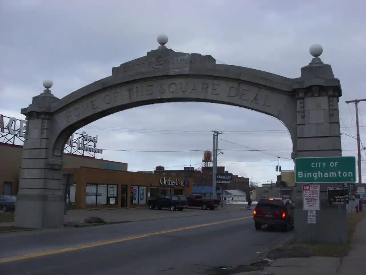 Johnson City Square Deal Arch is a historic "welcome arch" located at Johnson City in Broome County, New York. It is one of two identical arches erected in 1920 in Johnson City and in nearby Endicott, known as the Endicott Square Deal Arch. It was originally constructed by Endicott-Johnson Shoe Company employees to honor George F. Johnson (1857–1948), their highly respected employer and benefactor. See also: Read more on Wikipedia