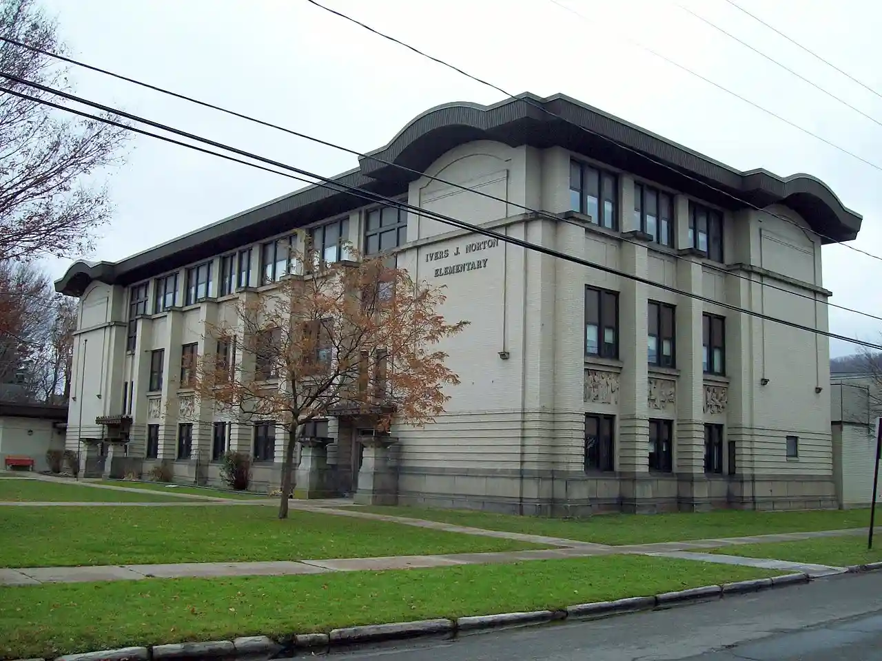 Olean School No. 10, now known as Ivers J. Norton School, is a historic school building located at Olean in Cattaraugus County, New York. It was designed and built in 1908–1909, in the Prairie School style. It is three stories, nine bays wide and four bays deep. It is constructed of brick and stone and topped with a flat roof with deep overhangs. It features "Boys" and "Girls" entrances and large brick engaged columns on the front facade. See also: It remained in operation as a school building until 2012, when it (along with the Boardmanville school) was closed as a result of budget cuts implemented in the wake of New York's property tax cap. In late 2014 the school was purchased by a pastor and turned into a church. Read more on Wikipedia