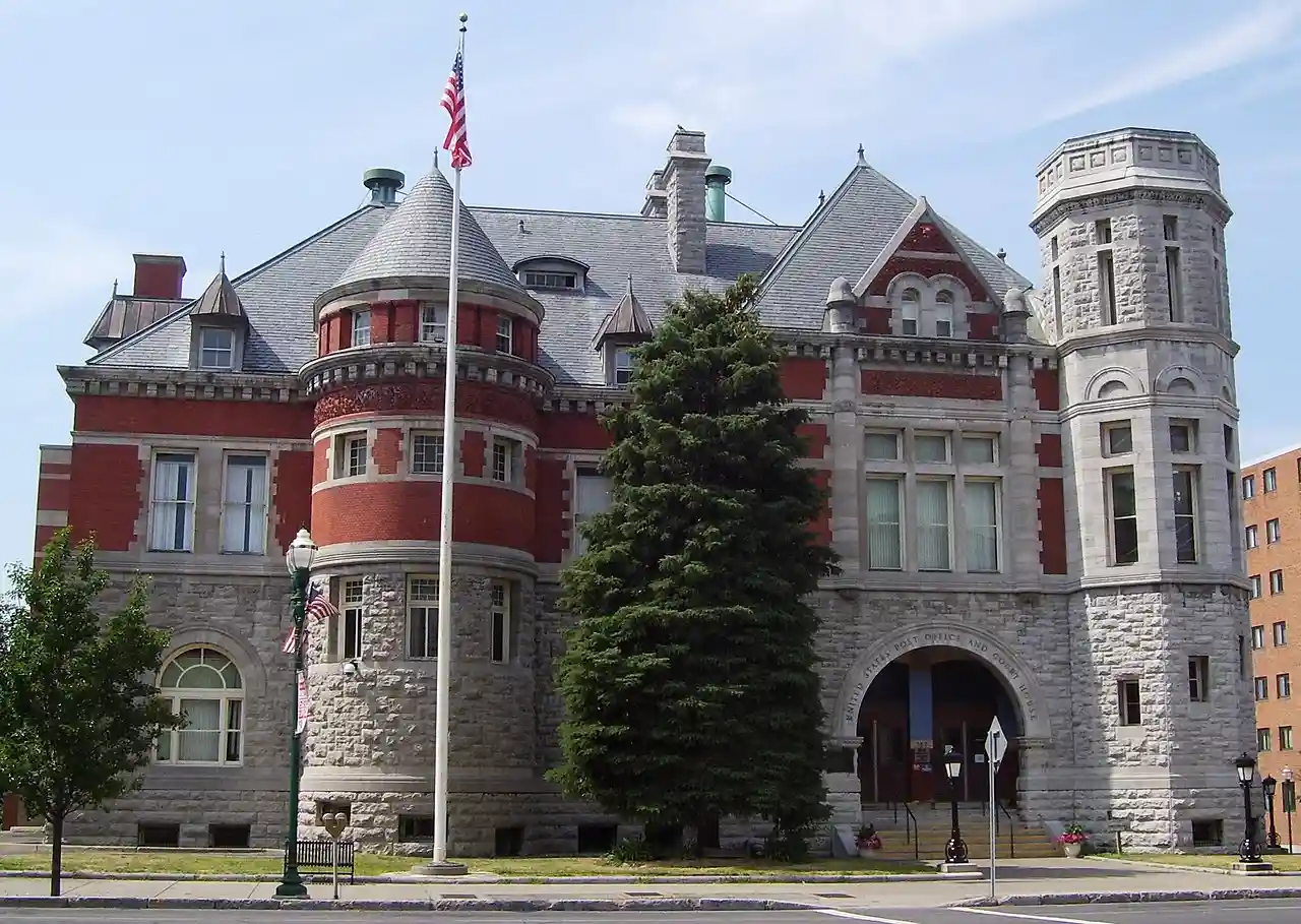 The Old Post Office and Courthouse is a historic courthouse and former post office located at 157 Genesee Street in Auburn, New York. It was built in 1888–1890 and was designed by the Office of the Supervising Architect of the Treasury Department, Mifflin E. Bell, in the Richardsonian Romanesque style. The limestone-and-brick building was expanded in 1913–1914, designed by James M. Elliot, and again in 1937. It serves as a courthouse of the United States District Court for the Northern District of New York.U.S. District Court for the Northern District of New York The massive, asymmetrical, -story main block (1888) includes a 3-story tower at the southwest corner, a -story stair tower, and two massive Richardsonian Romanesque–style entrances. Read more on Wikipedia