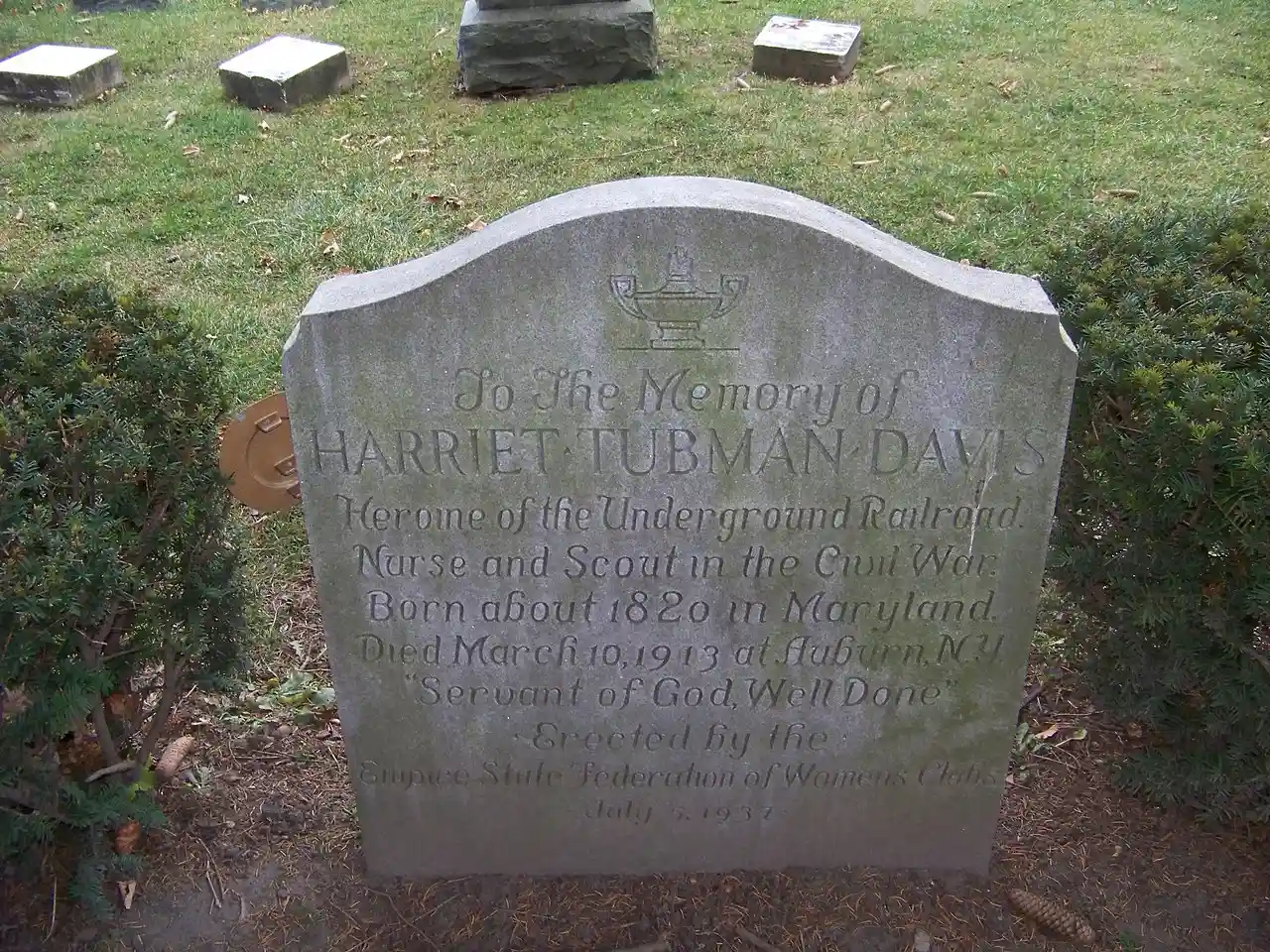 Harriet Tubman Grave is an historic gravesite located in Fort Hill Cemetery at Auburn, in Cayuga County, New York. The granite gravestone marks the resting place of famed African-American abolitionist and Christian Harriet Tubman, who was born into slavery in Maryland in the United States in 1822. Read more on Wikipedia