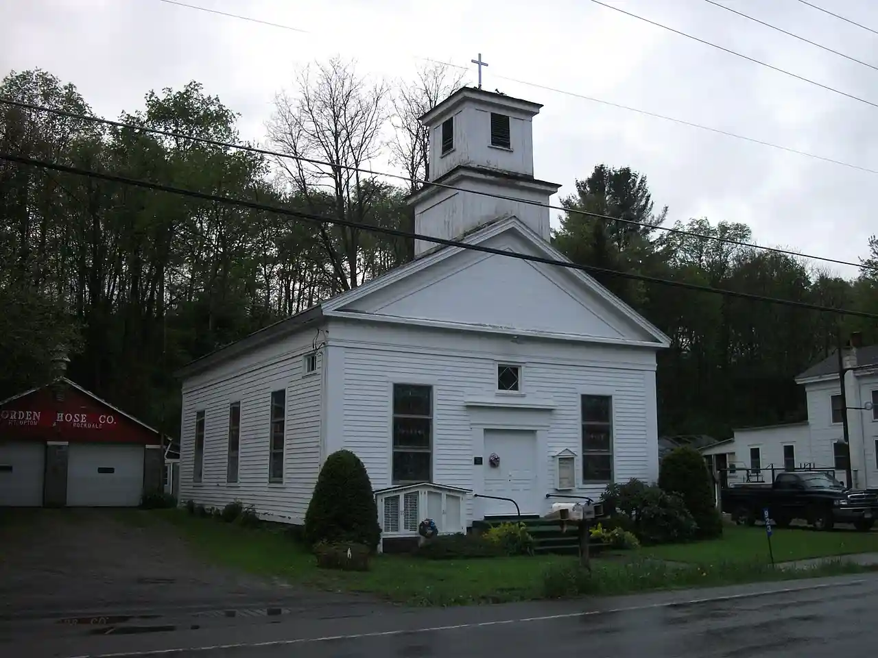 Rockdale Community Church is a historic church on New York State Route 8 in the hamlet of Rockdale, Chenango County, New York. It was built in 1860 and is a one-story rectangular wood-frame building, three bays long and three bays wide. It sits on a stone foundation and is surmounted by a gable roof. It features a two-stage tower topped by a small cross. See also: Read more on Wikipedia