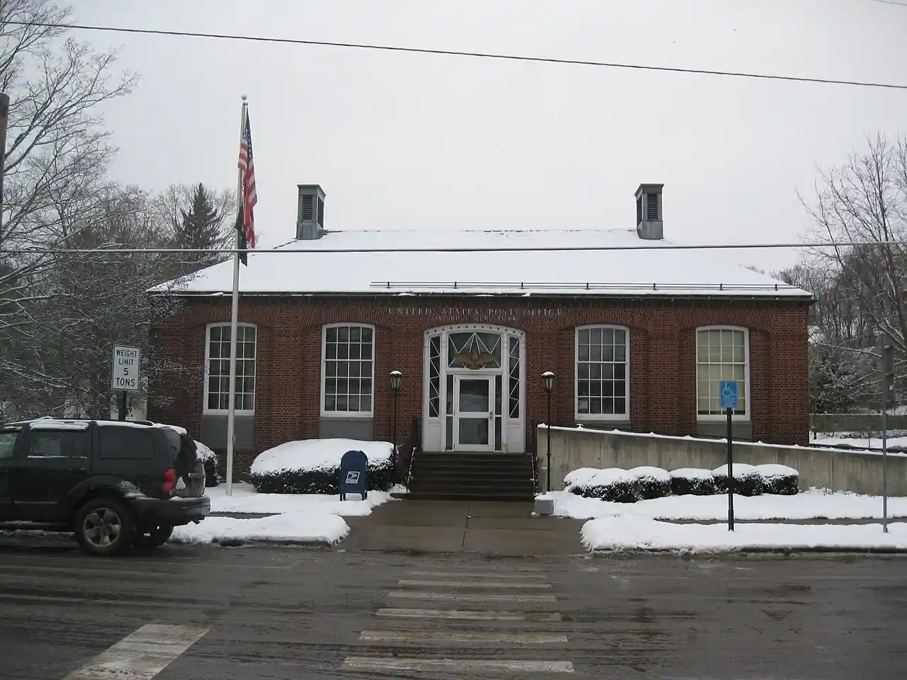 US Post Office-Oxford is a historic post office building located at Oxford in Chenango County, New York, United States. It was built in 1939–1940, and is one of a number of post offices in New York State designed by the Office of the Supervising Architect of the Treasury Department under Louis A. Simon. It is a one-story, five-bay, steel-frame structure on a raised, poured-concrete foundation with a molded-brick watercourse. It's square, with a slate-covered hipped roof in the Colonial Revival style. The interior features a 1941 mural by Mordi Gassner titled "Family Reunion on Clark Island: Spring 1791." It is located within the Oxford Village Historic District. Note: This includes and Accompanying 10 photographs Read more on Wikipedia