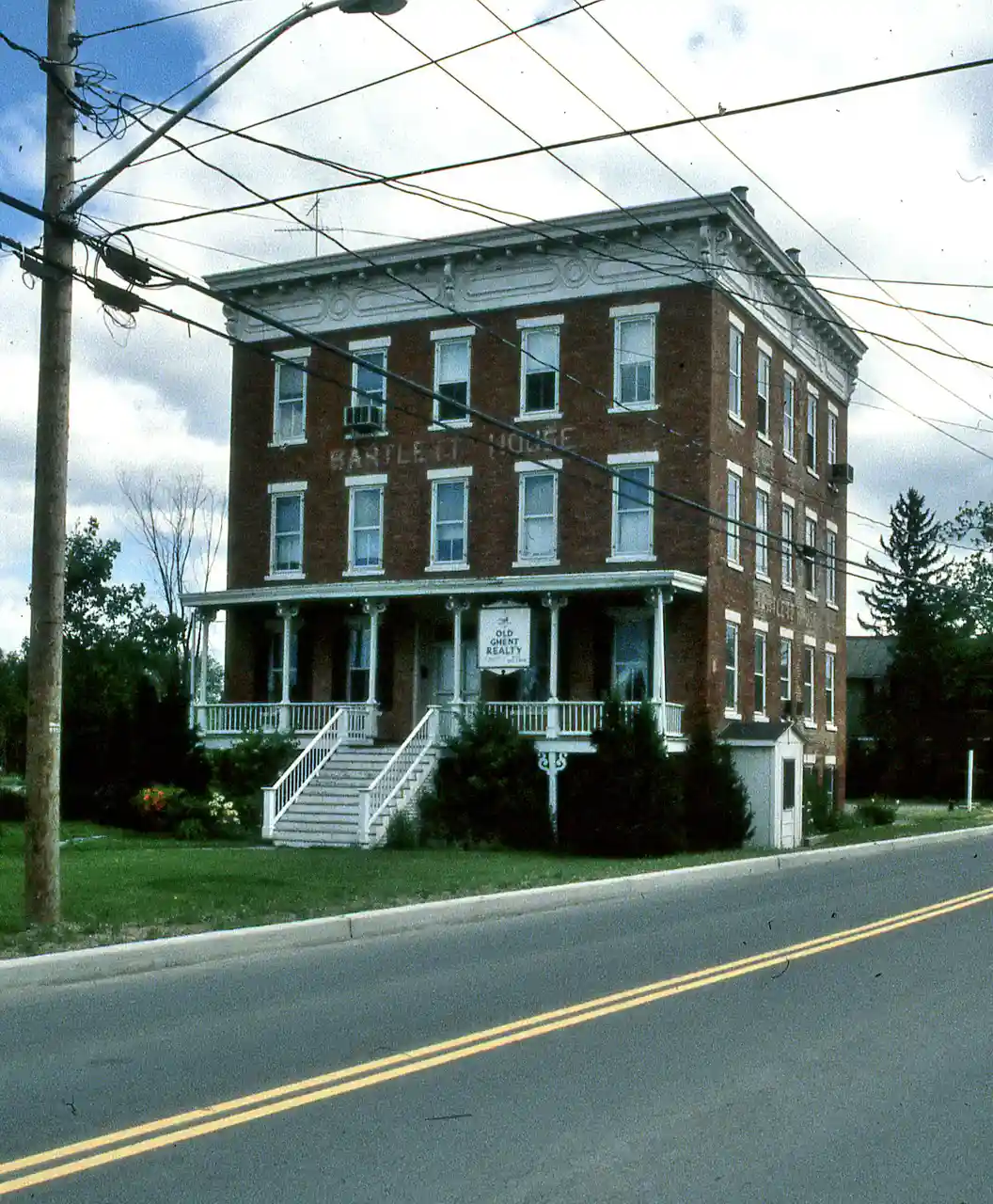 Bartlett House, a historic railroad hotel, restored in 2016 to house a kitchen, bakery, and cafe. It was built about 1870, and is a three-story, five bay by five bay, square, Italianate style brick building on a raised basement. It features a full width front porch at the primary story and decorative cornice. The name BARTLETT HOUSE appears in white lettering between the second and third stories. Note: This includes and Accompanying photographs Read more on Wikipedia