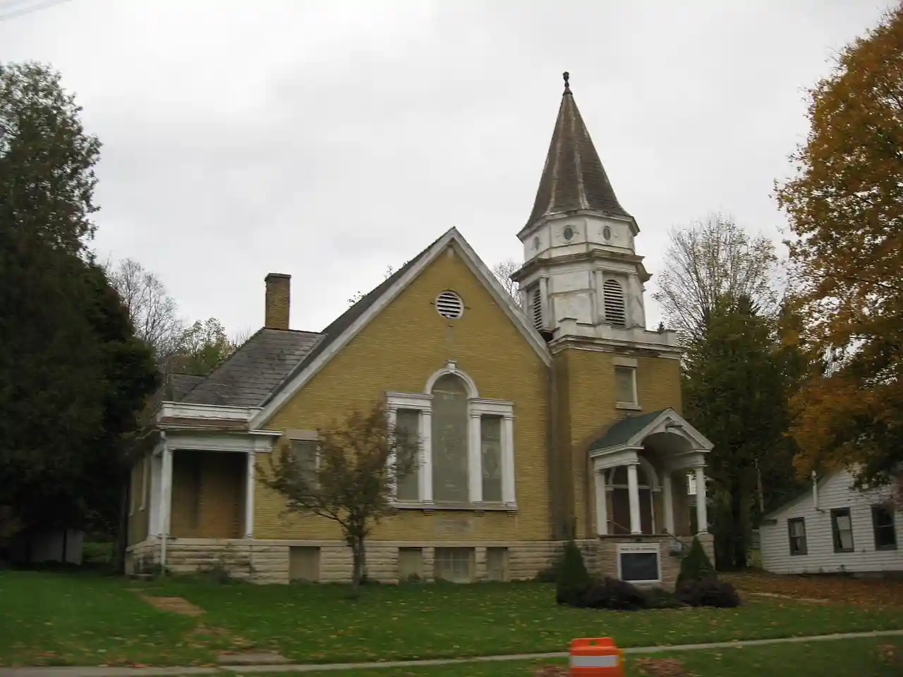 Presbyterian Church of McGraw is a historic Presbyterian church located at McGraw in Cortland County, New York. It was built in 1901 to designs by architects Pierce & Bickford and is a one-story structure, irregular in plan and massing, built of "Canandaigua gold brick". It features a tower that is square in plan at the base, but above the roofline rises in two octagonal stages built of wood with round arched louvered belfry openings and elliptical windows. It is topped by an octagonal spire crowned by a cast metal finial. The interior features an octagonally shaped auditorium and Palladian windows. See also: Read more on Wikipedia