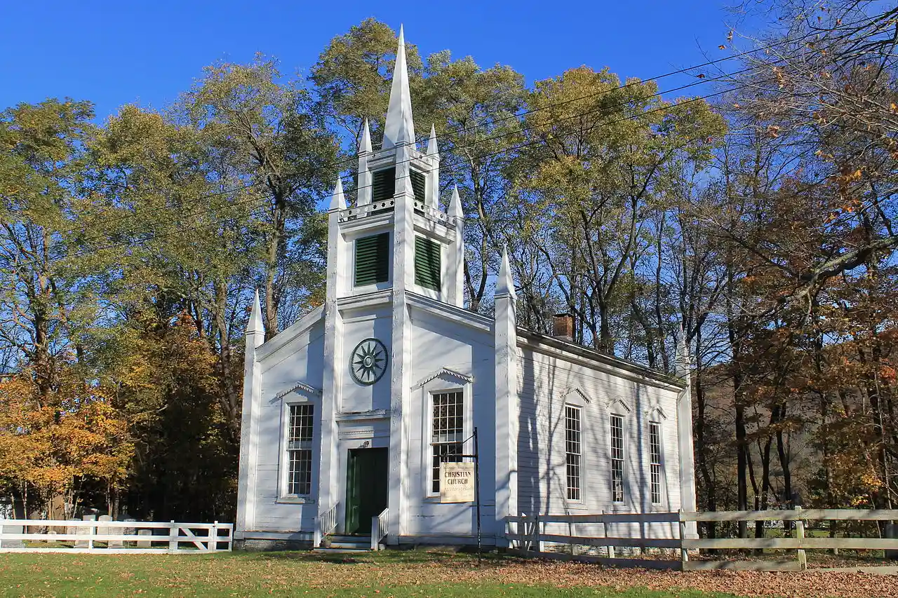 Christian Church, also known as Fitches Bridge Church, is a historic church on NY 10 at East Delhi in Delaware County, New York. It was built in 1861 and is in the Greek Revival style with an overlay of Gothic Revival decoration. It is a small rectangular structure of post and beam construction. It features 12 narrow, engaged towers with pinnacles that mark the corners of the building. See also: Read more on Wikipedia