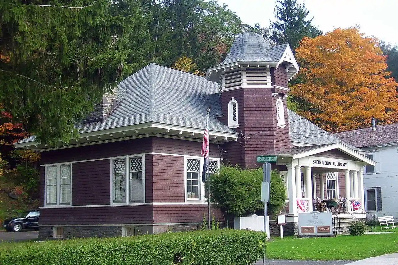 The Skene Memorial Library is located on Main Street in Fleischmanns, New York, United States. It is also used as the village hall. The frame building, combining elements of the Queen Anne and Shingle architectural styles, dates to the early 20th century. Its exterior incorporates aspects of local train station architecture. Read more on Wikipedia