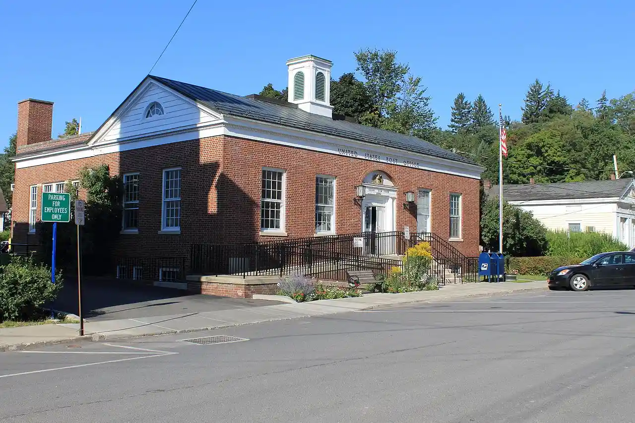 US Post Office-Delhi is a historic post office building located at Delhi in Delaware County, New York, United States. It was built in 1938, and is one of a number of post offices in New York State designed by the Office of the Supervising Architect of the Treasury Department, Louis A. Simon. It is a symmetrically massed one story brick building with a stone watertable in the Colonial Revival style. The front section features a copper clad gable roof crowned by a square flat-topped cupola with Doric order pilasters and round arched vent openings on each face. The interior features a 1940 mural by artist Mary Earley titled Down-Rent War, Around 1845. See also: Read more on Wikipedia