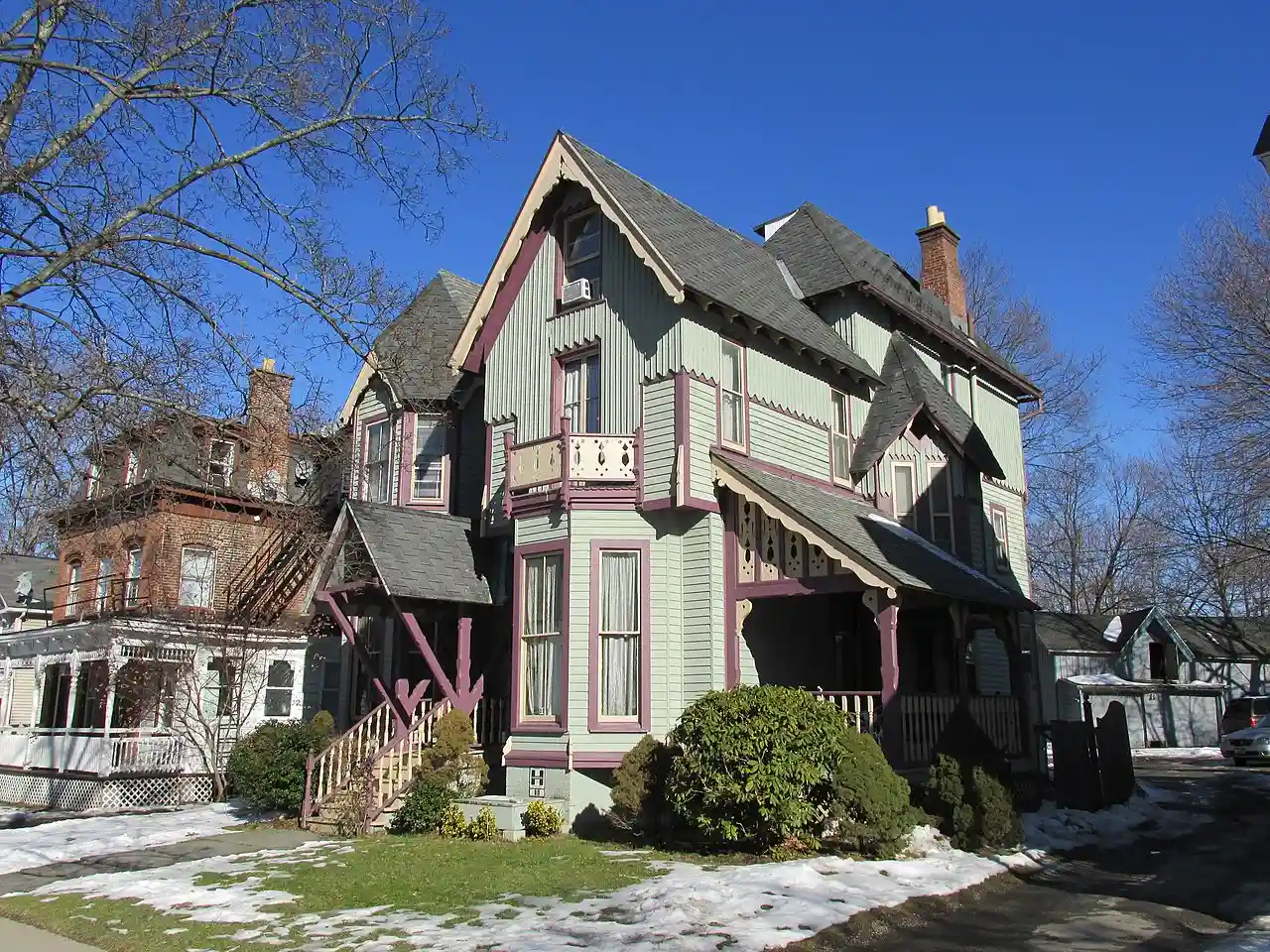 Hershkind House is a historic home located at Poughkeepsie, Dutchess County, New York. It was built about 1885 and is a -story, five-bay-wide Swiss chalet–style dwelling with a steeply pitched roof. It features a three-sided bay with a four-sided conical roof with V-shaped cutouts. It also has board-and-batten and clapboard siding, pierced balcony railings, and a stick style porch. Read more on Wikipedia