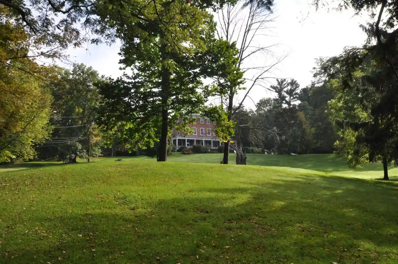 The original section of the Grove (ca. 1795), the country seat of Philip Jeremiah Schuyler and, subsequently, Mary Morton Miller, embodies the prototypical two-story, five-bay, center-hall form associated with the Federal period. Schuyler was married to Sarah Rutsen, and the land had been in the Rutsen family. The Landsman Kill, running through the property, had been the site of the Rutsen family's grist and saw mills, important settlement period industrial concerns in Rhinebeck during the early- to mid-eighteenth century. Schuyler acquired the mills, which he continued to operate, and a large parcel of land upon which he erected his elegant Federal style mansion. (The subsequent evolution of the Grove, in form, scale and decorative detailing, and its nineteenth-century historical associations place its primary significance in a later period as a 19th-century country seat. A carriage house on the property was built in the 1890s and is attributed to the architectural firm of McKim, Mead & White. Read more on Wikipedia