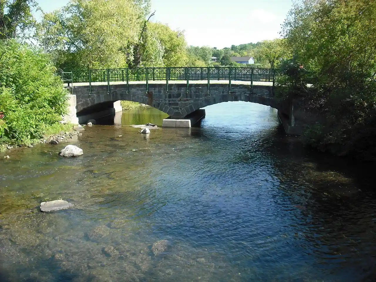 Frazier Bridge is a historic Double arched bridge over the La Chute River at Ticonderoga in Essex County, New York. It was built in 1894 and is a double-arched masonry bridge, 23 feet wide and spanning 50 feet at roughly 10 feet above water level. See also: Read more on Wikipedia