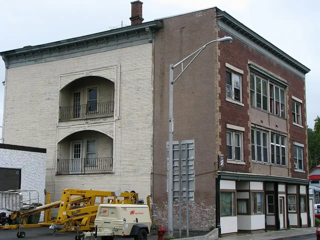 Leis Block is a historic commercial building located at Saranac Lake in the town of Harrietstown, Franklin County, New York. It was built in 1902 and is a three-story wood-frame structure. Renovations between 1910 and 1914 that added the current brick front, resulted in four full apartments, each containing a central inset sleeping porch. The storefronts once were occupied by Henry Leis's piano and music store and Earl Finegan's pharmacy. Henry Leis, who owned the block until his death in 1940, also built the Leis Cottage. The current structure has ten apartments and two storefronts. See also: The pharmacy at one time was named Terminal Pharmacy because it was the bus stop. Later it was renamed Hoffman Pharmacy. Read more on Wikipedia