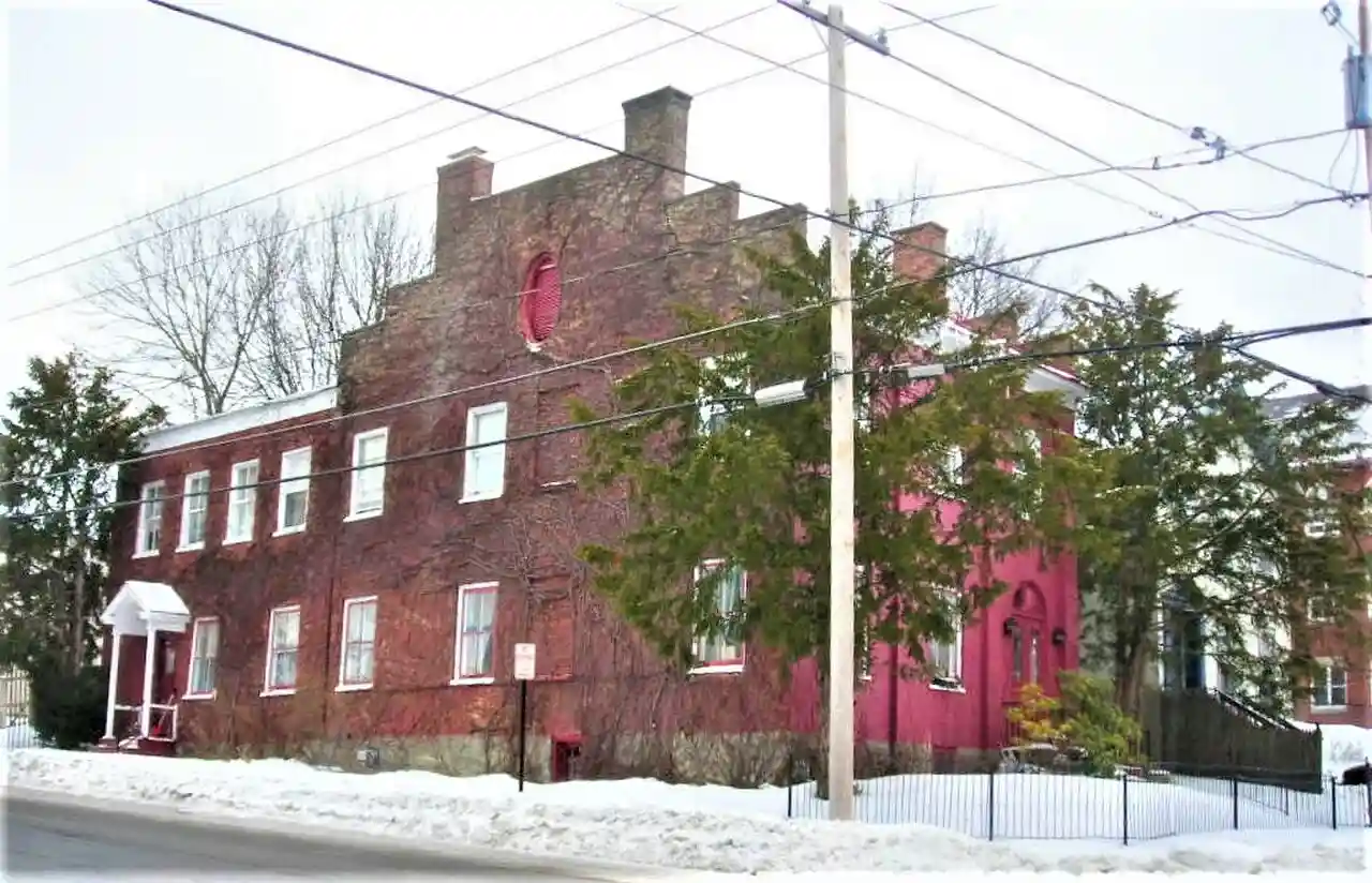 The Chamberlain Benjamin House is a historic home at 100 South Market Street at the corner of Clinton Street Johnstown, Fulton County, New York. It was built in 1816 and is a -story, gable-roofed, brick, Federal period residence. It consists of a three-by-four-bay main block with a long, rectangular 2-story, four-bay rear wing. The interior is based on a side-hall plan. It features a blind-arcade front with brick pilasters and stepped parapet gable ends. See also: Read more on Wikipedia