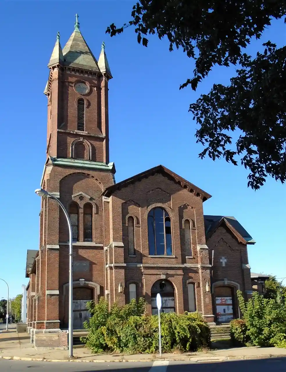 First United Methodist Church is a historic United Methodist church at 7 Elm Street at Bleecker Square in Gloversville, Fulton County, New York. It was designed by Horatio Nelson White in the Romanesque Revival style and was built from 1869 to 1870. The main block / sanctuary is a two-story red brick structure set on a cut stone foundation. It is flanked by a staged entrance / bell tower and two-story office wing. An addition was completed in 1909 and is a two-story, polygonal brick structure containing a chapel, Sunday School room and parish hall. See also: Read more on Wikipedia