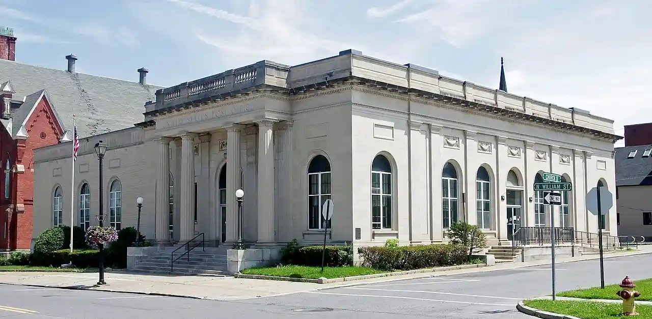 The US Post Office-Johnstown is a historic post office building located at 14 North William Street in Johnstown, Fulton County, New York. It was designed and built in 1912–1913, and is one of a number of post offices in New York State designed by the Office of the Supervising Architect of the Treasury Department, James Knox Taylor. It was enlarged in 1965–1966. The original section is a five-by-seven-bay, 1-story limestone structure on a granite foundation in the Classical Revival style. The entrance portico features four Doric order columns supporting an entablature. The building also features semi-circular arched windows. See also: Read more on Wikipedia