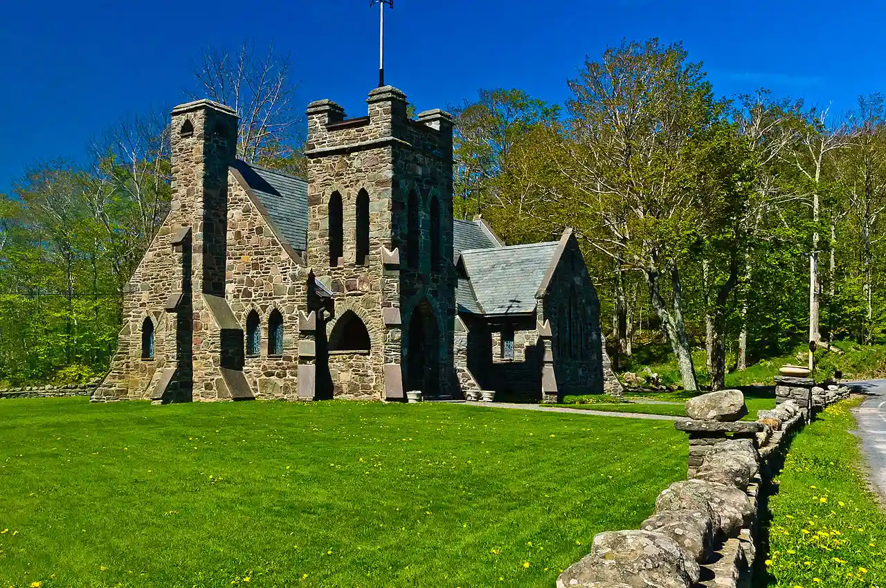 All Souls Church is a historic Episcopal church located at Tannersville in Greene County, New York. It was built in 1894 as a small stone chapel in the Gothic Revival style. It was subsequently enlarged in the 1910s with the enlargement of the chancel and addition of transepts. It features a large square bell tower at the southwest corner that also serves as the principal entrance. See also: Read more on Wikipedia