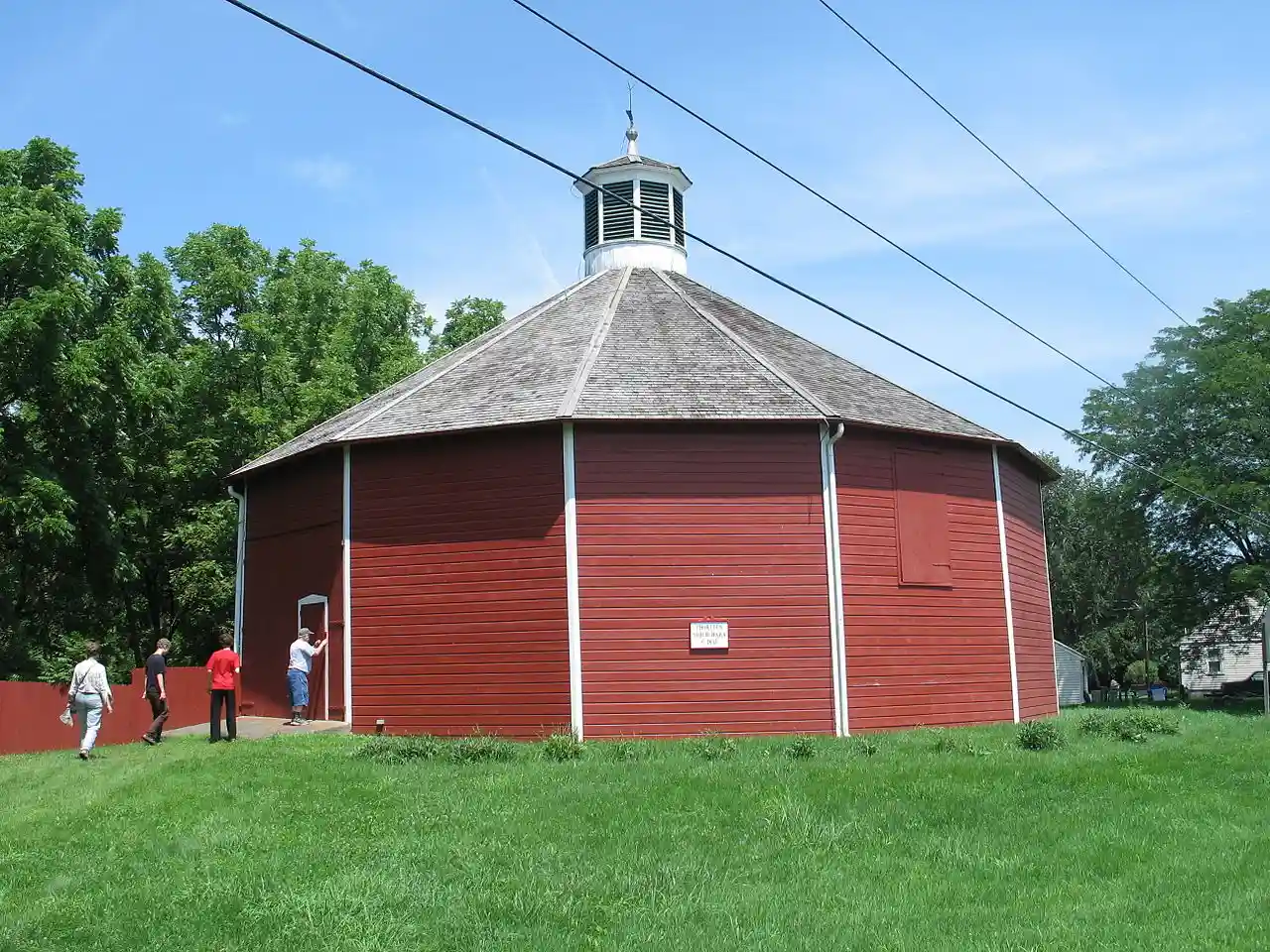 Bronck Farm 13-Sided Barn is a historic barn located at Coxsackie in Greene County, New York. It was built about 1832 and is a 13 sided frame structure with a hipped roof surmounted by an octagonal cupola. It has an overall diameter of 70 feet and the one story interior is open in plan. It is related to, but listed separately from the Bronck House. See also: Read more on Wikipedia