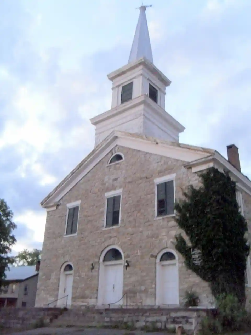 Leeds Dutch Reformed Church is a historic Dutch Reformed church on Co. Rt. 23B (Susquehanna Turnpike) in Leeds, Greene County, New York. It was built about 1818 and is a two-story, gable fronted stone church with restrained Federal / Greek Revival style features. It is rectangular in plan, three bays wide and four bays deep. It features a square, two stage belfry topped by an octagonal, metal shingle clad spire added about 1855. See also: Read more on Wikipedia