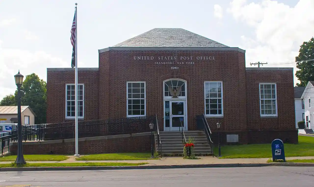 US Post Office-Frankfort is a historic post office building located at Frankfort in Herkimer County, New York, United States. It was built in 1940–1941, and is one of a number of post offices in New York State designed by the Office of the Supervising Architect of the Treasury Department, Louis A. Simon. It is a one-story, five-bay, steel frame building on a raised foundation in the Colonial Revival style. It features a three-bay central pavilion surmounted by a slate-covered hipped roof. The interior features a 1942 wood relief by artist Albert Wein titled "Growth." Note: This includes Read more on Wikipedia