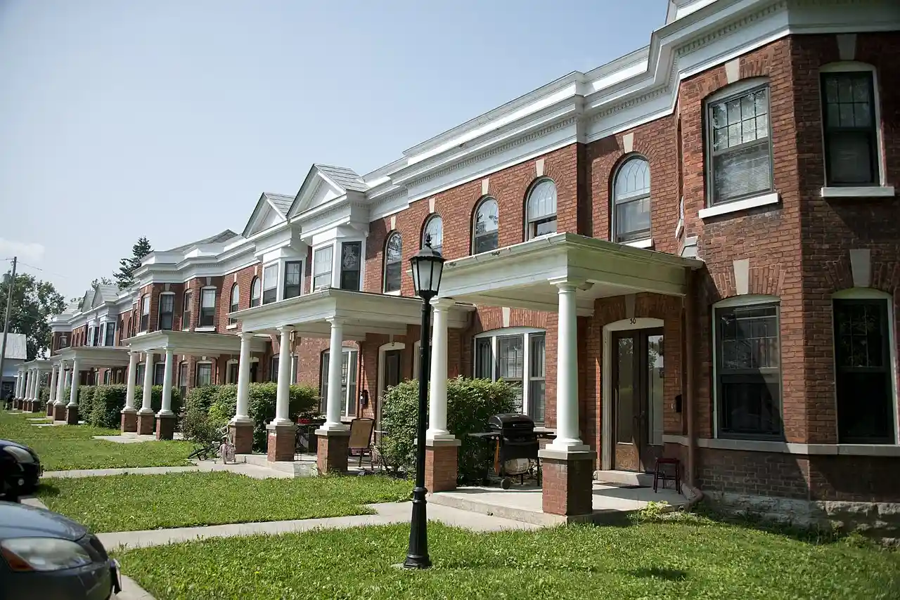 Emerson Place is a historic townhouse complex located at Watertown in Jefferson County, New York. It was built in 1904 and is a two-story, flat-roofed, brick, nearly symmetrical set of eleven units in the Colonial Revival style. The long facade of the structure is articulated by a series of 3 two-story, projecting, three-sided bay windows; one at each end and a larger one near the center. See also: Read more on Wikipedia