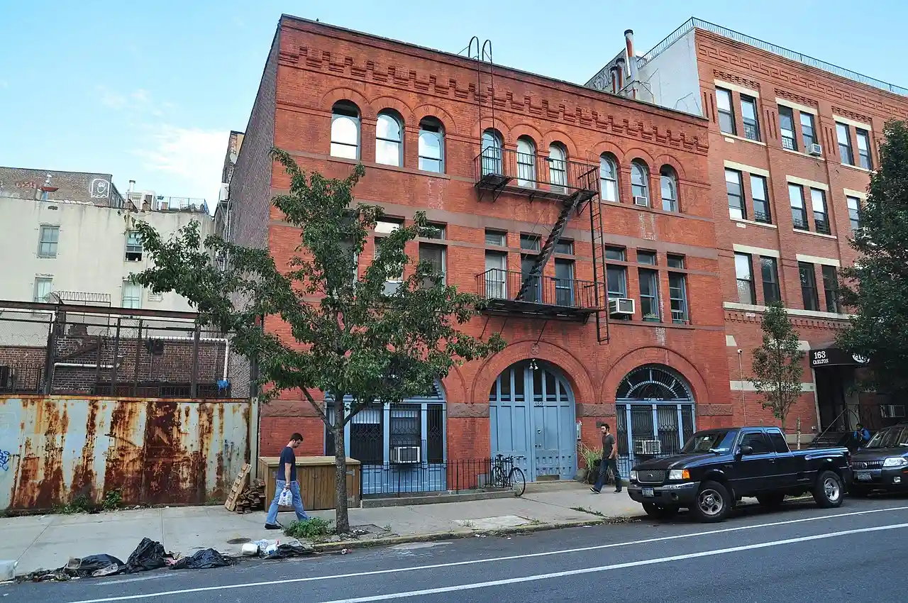 Feuchtwanger Stable is a historic stable building located in Fort Greene, Brooklyn, New York. It was built in 1888 in the Romanesque Revival style. It is a three-story brick structure trimmed with stone and terra cotta. The first floor features three wide, round arches that once served as entrances for horses. See also: The building has housed a candy factory, a storage warehouse, and an auto repair garage. It was converted into loft condominiums in 1988. Read more on Wikipedia