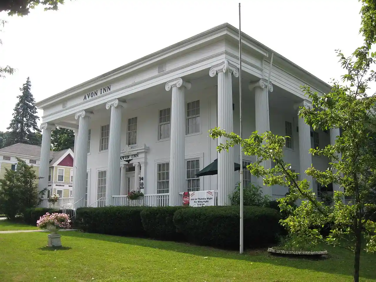 Avon Inn is an historic inn located in Avon, USA, in Livingston County, New York. The main block was built in the 1840s as a residence in the Greek Revival style. The five bay structure features a two-story portico supported by massive Ionic columns. Read more on Wikipedia