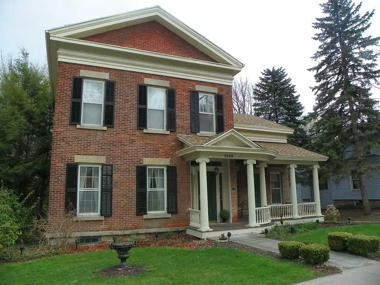 Cargill House is a historic home located at Lima in Livingston County, New York. It was built about 1852 and is an elegant L-shaped, Greek Revival–style brick dwelling. It features a 2-story, three-bay, side-hall main block with a pedimented gable oriented toward the street. Also on the property is a -story carriage barn, two cut-stone hitching posts, and a spring-fed pond. Read more on Wikipedia