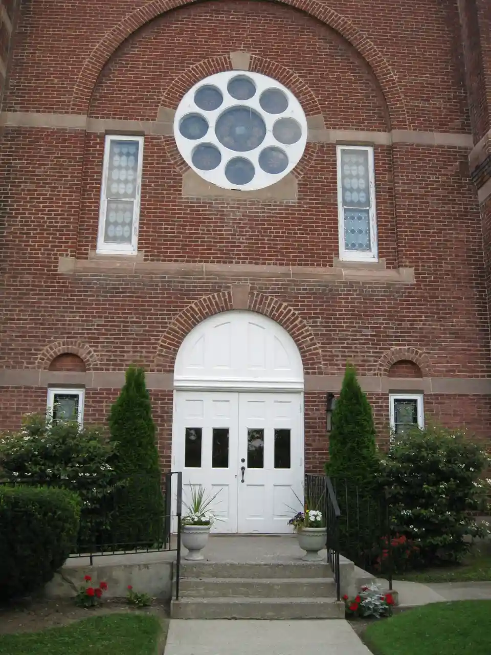 First Methodist Episcopal Church of Avon, also known as Avon United Methodist Church, is a historic Methodist Episcopal church located at Avon in Livingston County, New York. It was designed by Rochester architect James Goold Cutler and built in 1879. It is a three- by five-bay Romanesque style brick building. The principal elevation is flanked by an engaged tower at the south end and low pavilion and chimney on the north. The center of the principal elevation is accented by a large recessed round arch at the upper level that contains a large center oculus window flanked by two small vertical windows. See also: Read more on Wikipedia