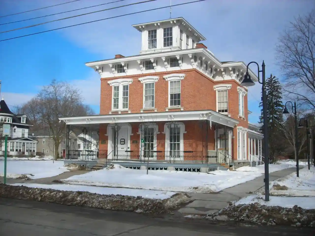 Adon Smith House is a historic home located at Hamilton in Madison County, New York. It was built about 1850 and is a -story brick dwelling with Italianate elements. It features a U-shaped porch with elaborate wrought iron columns and railings and has a glazed belvedere. It is now used as the village office building. See also: Read more on Wikipedia