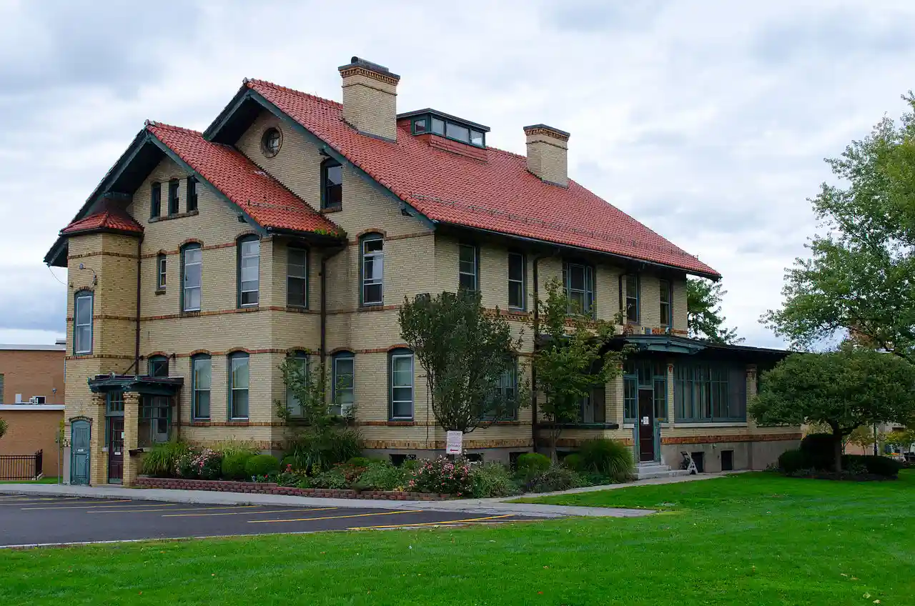 Adolph Lomb House is a historic home located at Pittsford in Monroe County, New York. It is a large -story building with a gable roof oriented to the facade. It was built in 1907 of poured concrete faced in brick. It was built as the focal point of a large farm / summer estate for Adolph Lomb, eldest son of Henry Lomb (1848–1908), one of the co-founders of the Rochester-based optical company Bausch and Lomb. See also: Read more on Wikipedia