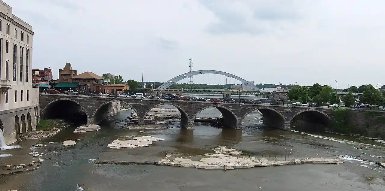Court Street Bridge is a historic stone arch bridge located at Rochester in Monroe County, New York. It was designed by city engineer J. Y. McClintock, constructed in 1893, and spans the Genesee River. It has six shallow arches over the river and two arches over the Johnson and Seymour Raceway and Erie Canal. Shallow arch spans are 52 feet and rises vary from 13 to 20 feet. See also: Read more on Wikipedia
