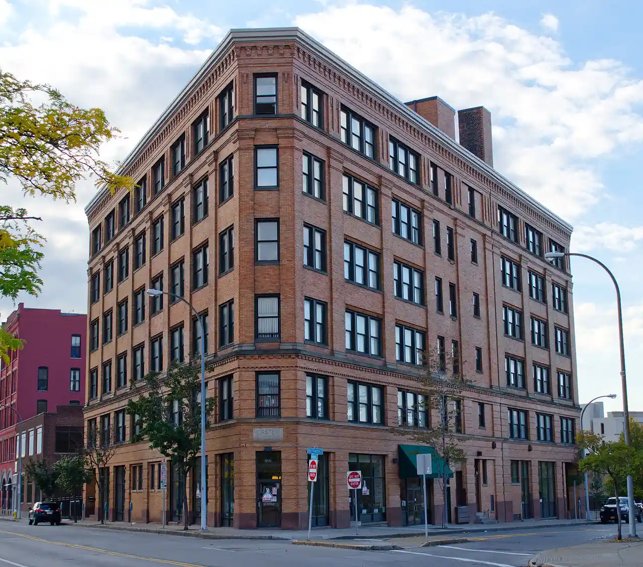 The Kirstein Building is a historic industrial and commercial building located in Rochester in Monroe County, New York. It is a six-story, large triangular yellow brick structure with Classical Revival details. It was built in 1908 for E. Kirstein and Sons, Co., later Shuron Optical Company, a manufacturer of optical products. The company continued to use the building for offices and production until 1965. See also: Read more on Wikipedia
