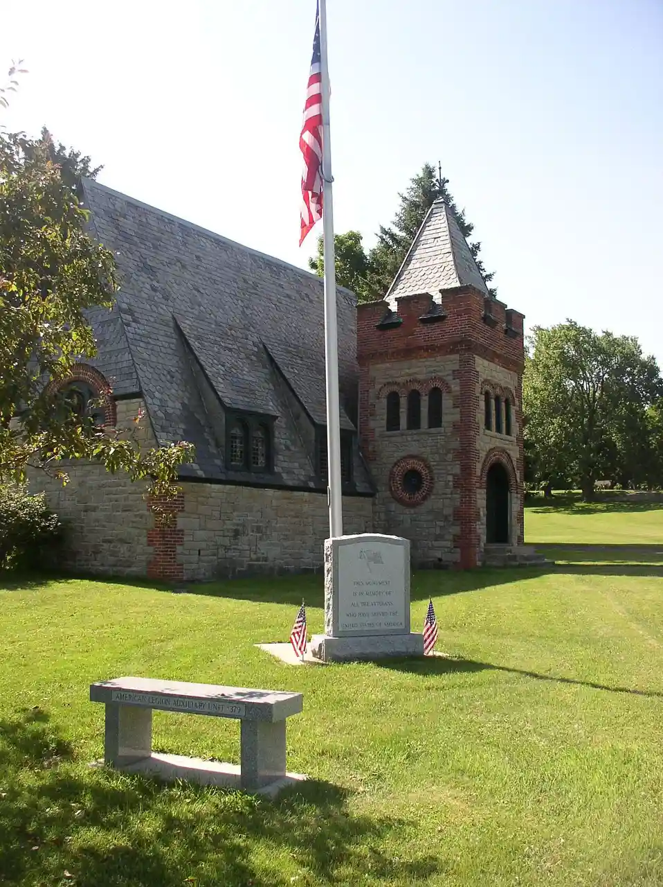 Lake View Cemetery is a historic rural cemetery in the town of Sweden, near Brockport in Monroe County, New York. The cemetery was established in 1891. It includes a Romanesque Revival style chapel / receiving vault, a small pond, a cast iron tiered fountain, and a distinctive serpentine road system. See also: Read more on Wikipedia
