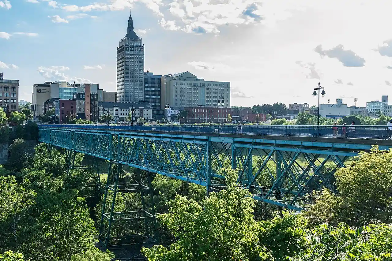 The Pont De Rennes bridge is located in the Brown's Race Historic District of Rochester New York at the base of the High Falls where it spans the Genesee River. The Pont De Rennes bridge formerly carried Platt Street over the river but was converted to pedestrian use in 1982 as part of a redevelopment of the High Falls area as an entertainment area. The bridge was renamed the Pont De Rennes for Rochester's sister city Rennes in France as part of the conversion. The Pont De Rennes bridge provides unobstructed views of the High Falls and downstream gorge. Read more on Wikipedia