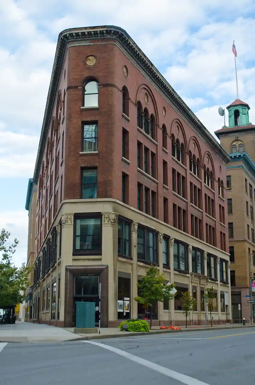 Sibley Triangle Building is a historic commercial building located at Rochester in Monroe County, New York. It is a five-story, triangular, flat-iron shaped, brick commercial building with Indiana limestone and marble trim on the first two stories. It was built in 1897 and is a distinguished example of eclectic Italian Renaissance style architecture. It was designed by noted Rochester architect J. Foster Warner and built for Hiram W. Sibley, a son of Hiram Sibley. See also: Read more on Wikipedia