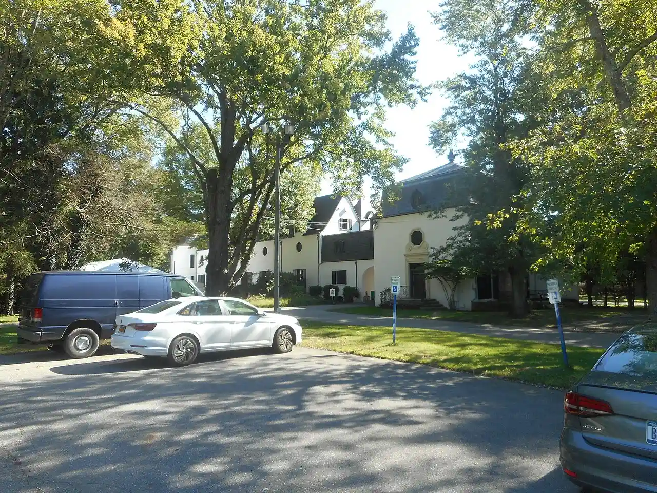 Benjamin Moore Estate, also known as Chelsea, is a historic estate located at Muttontown in Nassau County, New York. It was designed in 1923–1924 by architect William Adams Delano (1874–1960) for Benjamin Moore and Alexandra Emery. The manor house is an eclectic Chinese and French Renaissance style inspired dwelling. It is U-shaped, stories high with hipped and gable roofs, covered with concrete block on a concrete foundation. The front facade features a steeply pitched roof, four large irregularly spaced chimneys, and a large brick tourelle with a conical roof. The property also has a contributing formal garden, gatehouse, picturesque roadways, garage, conservatory, octagonal gazebo, shed and tool house, and large open lawns. See also: Read more on Wikipedia